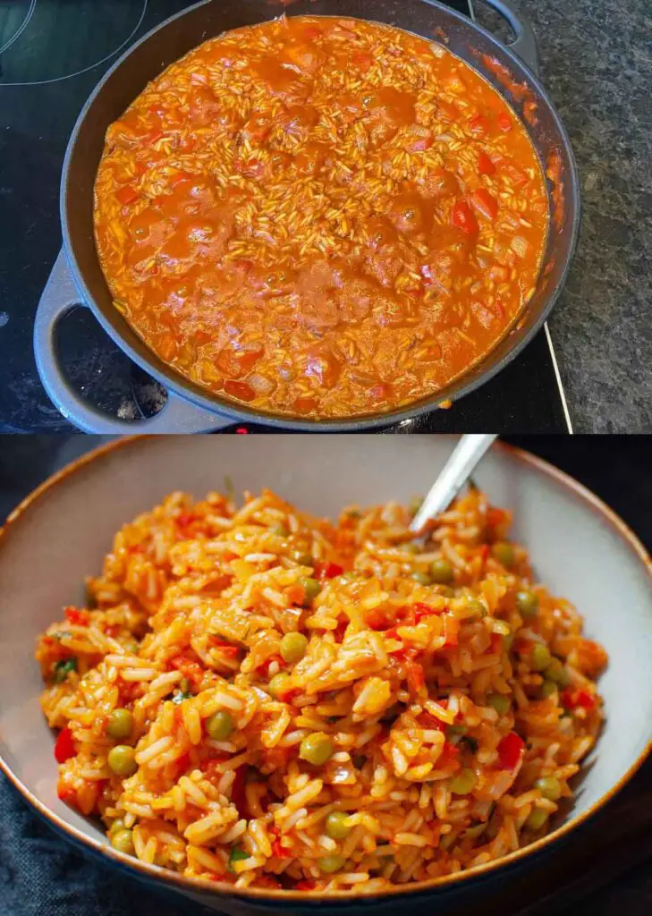 1. Zwiebel hacken, Knoblauchzehe pressen und beides in Butter anschwitzen. Jetzt Reis, Tomatenstücke, Brühpulver, Ajvar und Wasser hinzugeben und mit den Gewürzen gut abschmecken.
