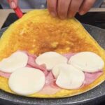 3. Jetzt legen Sie ein Blatt Filoteig auf eine saubere Oberfläche und dann bestreichen Sie die Filoteigblätter mit etwas Eigelb. Danach Wiederholen Sie den Vorgang zweimal, bis Sie insgesamt 3 Schichten haben.