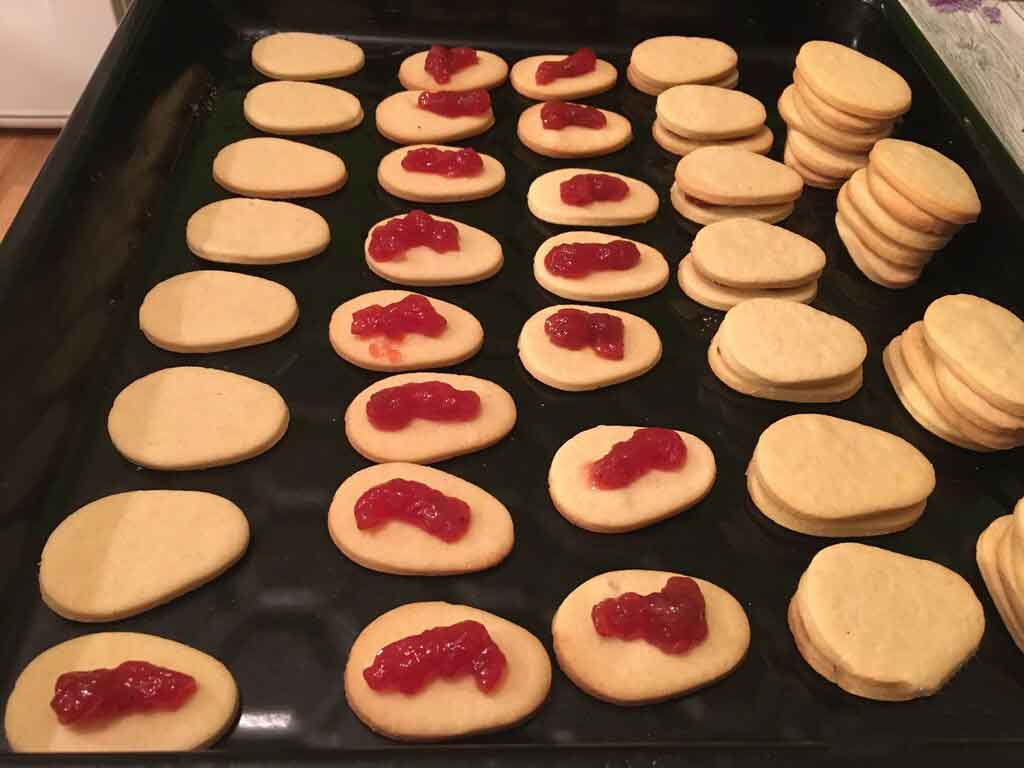 3. Abkühlen lassen, jeweils zwei Ovale mit Marmelade zusammensetzen und mit geschmolzener Schokolade und gehackten Walnüssen verzieren.