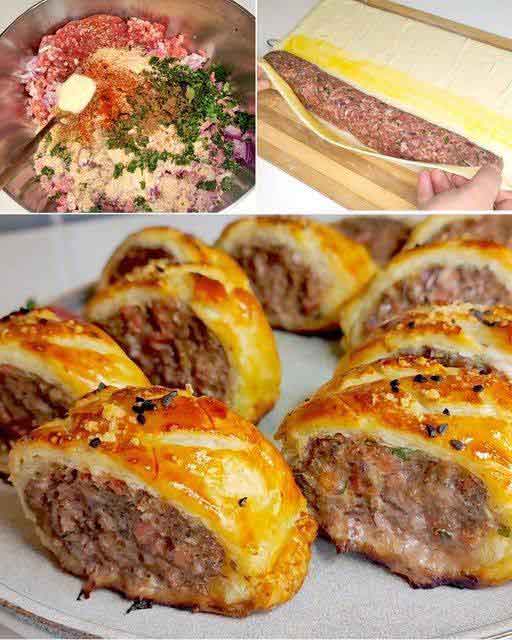 3. Den eingewickelten Laib auf das Backblech legen und ca. 20–25 Minuten backen, bis der Blätterteig goldbraun und knusprig ist und das Fleisch vollständig durchgegart ist.