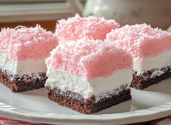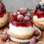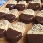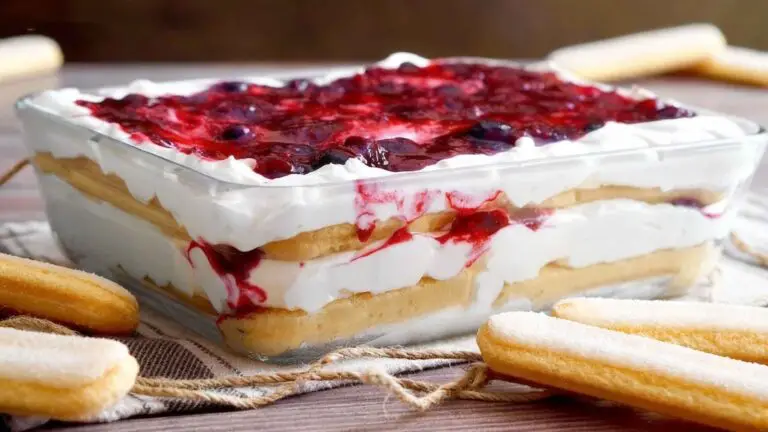 - Die in Kompottsirup oder Milch getränkten Kekse auf der Keule anrichten, Füllung, Pfirsiche und dann wieder alles, bis die Sahne aufgebraucht ist.